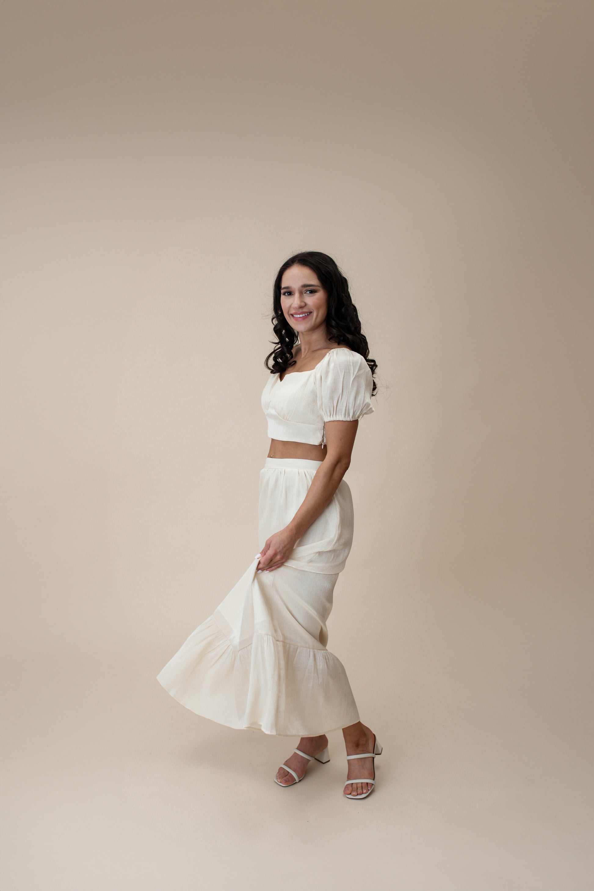 The lightweight ivory fabric drapes beautifully, creating a timeless silhouette that feels both elevated and easy to wear. Perfect for vacations, bridal events, summer soirées, or sunset strolls, this set can be styled together for a polished look or worn separately for endless outfit possibilities.