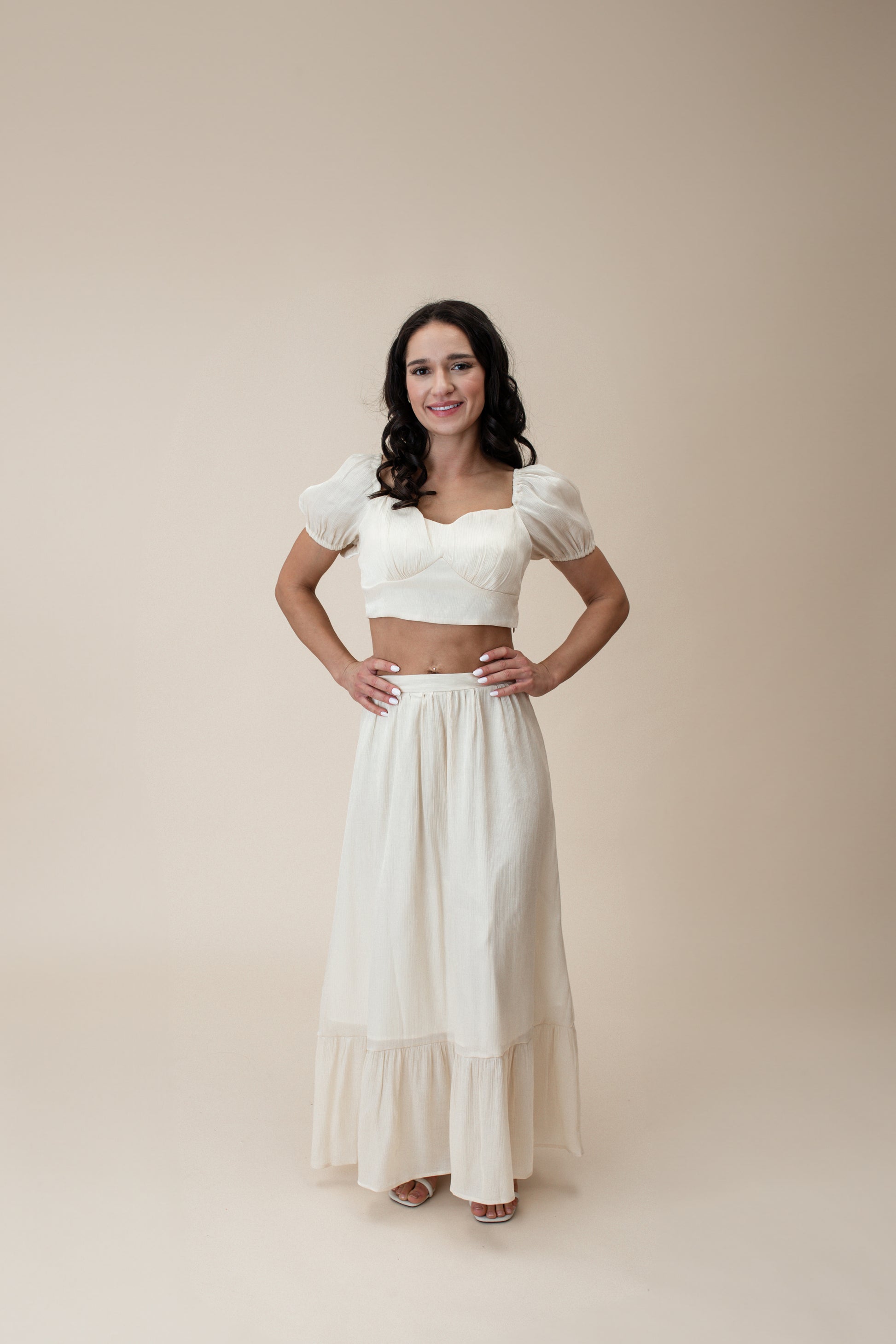 Soft, romantic, and effortlessly refined, the Cade's Cove Two-Piece Set is designed for sunlit days and unforgettable escapes. Featuring a cropped puff-sleeve top with a flattering sweetheart neckline and a flowing high-waisted maxi skirt, this set blends feminine structure with relaxed elegance.